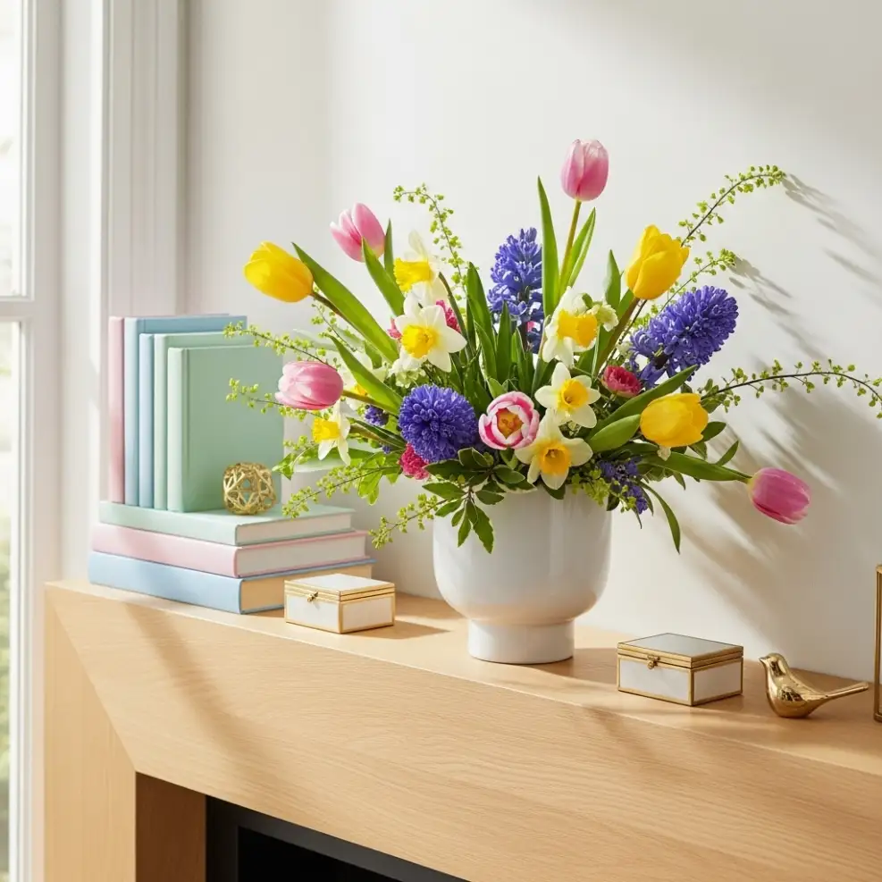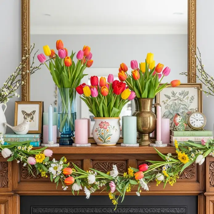 If your home runs neutral, think of your greenery and flowers as the “color” of your spring decor. Soft pink tulips, pale yellow daffodils, and fresh green stems instantly lift a dull mantel. They also play nicely with all decor styles, from farmhouse to modern.