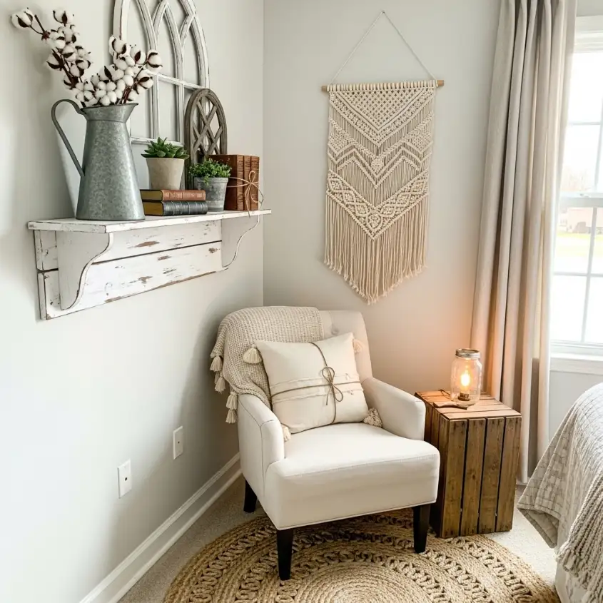 Since farmhouse spring bedrooms are all about comfort, turn that lonely chair into a tiny retreat: