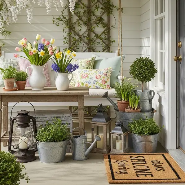 Got a porch with a skinny side or odd-sized step? Try grouping galvanized metal buckets or painted wooden crates as planters. Fill them with bright spring blooms, trailing ivy, or simple greenery. Even a single planter with a cluster of daffodils or pansies can liven up the space, making your porch a welcoming spot for guests—and you.