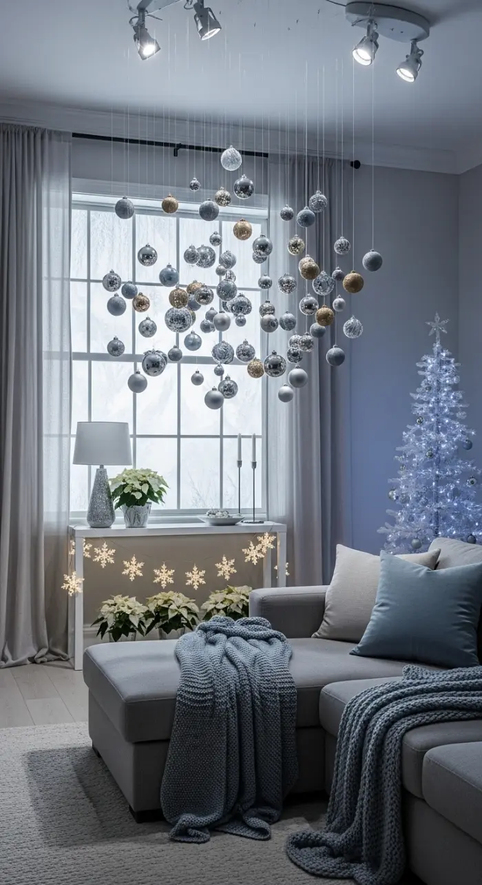 A console behind the sofa or along the wall can act as a subtle holiday accent spot. I often pair a lamp with a couple of winter items—like a ceramic house, a small bowl of ornaments, or a bit of greenery. Because it’s not a high-traffic area, you can keep the pieces simple and let the light do most of the work.