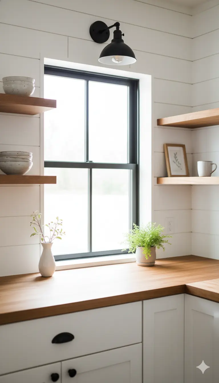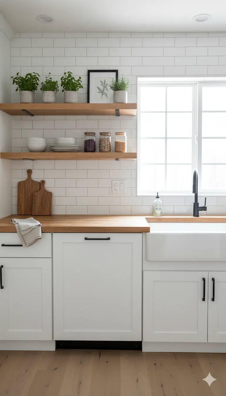 There’s a reason the modern farmhouse look is so popular—it’s warm, inviting, and effortlessly chic. Bring this charm into your kitchen by pairing crisp white walls with thick, rustic shelves made from reclaimed wood. The natural texture and imperfections of the wood add a layer of history and character that instantly makes a new kitchen feel lived-in and loved. To complete the look, display a collection of white ceramic dishes, mason jars filled with pantry staples, and a few pops of greenery.
