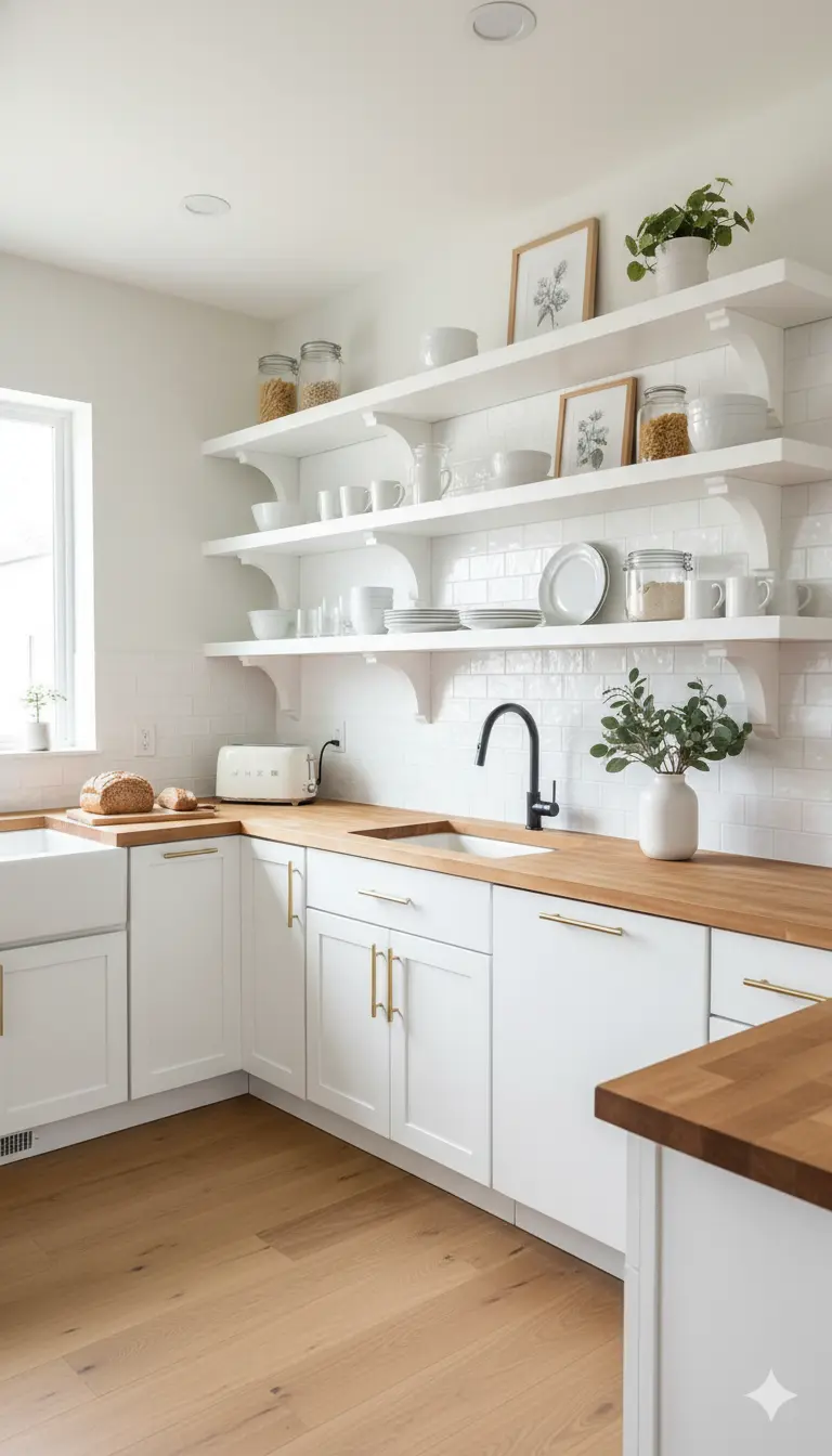 Don’t let those tricky corner spaces go to waste! Installing corner open shelves is a smart way to maximize every inch of your kitchen. These shelves are perfect for storing smaller items like spices, mugs, or small plants. They can also help to soften the sharp angles of a kitchen and create a more cohesive look.