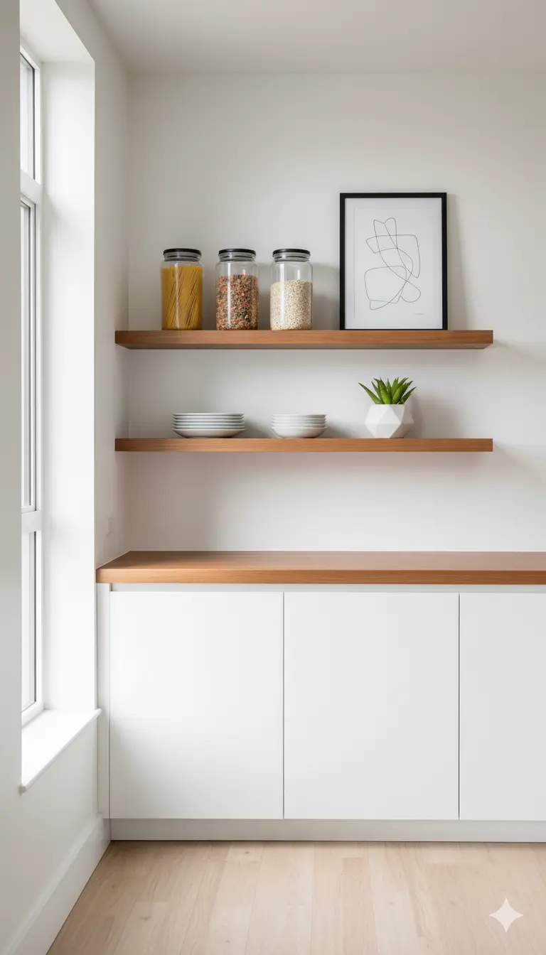 Combine the clean lines of minimalism with a touch of luxury for a truly sophisticated look. Think thick, white floating shelves styled with a very select few high-quality items. A beautiful ceramic pitcher, a stack of artisanal bowls, and a single piece of art can make a bigger impact than a cluttered shelf. Quality over quantity is the mantra for this elegant style.