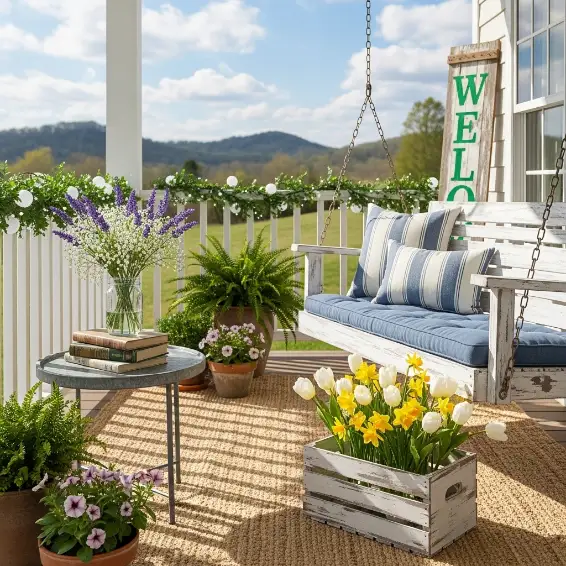 There’s no better way to evoke the feeling of a classic farmhouse than with a vintage-style porch swing. Choose one made from painted wood or distressed metal, and layer it with fresh floral or striped pillows for comfort. Position it near the center of your porch for the utmost visibility and enjoyment. A swing is both a statement piece and a functional addition, encouraging after-dinner conversations or lazy Sunday afternoons. This simple upgrade can turn your porch into the neighborhood’s favorite gathering spot while seamlessly fitting into your Farmhouse Spring Porch Decor theme.