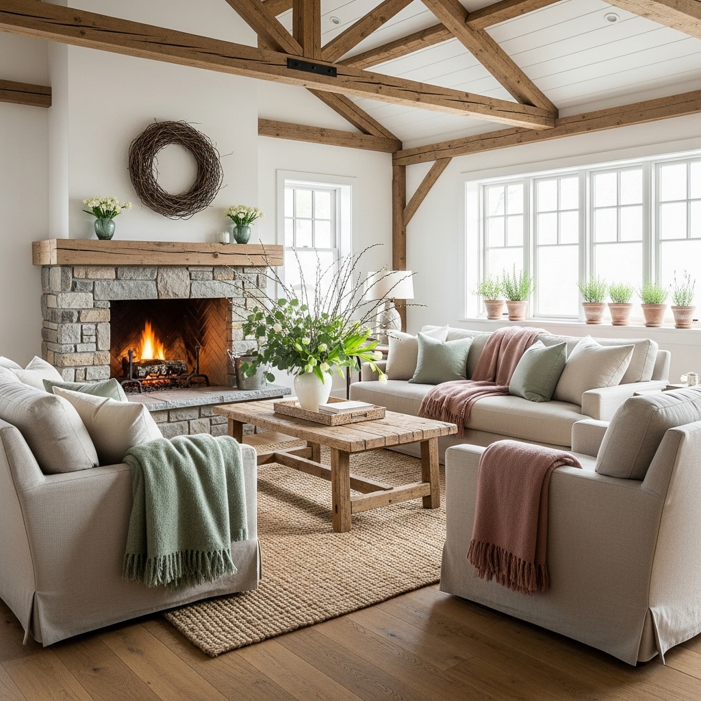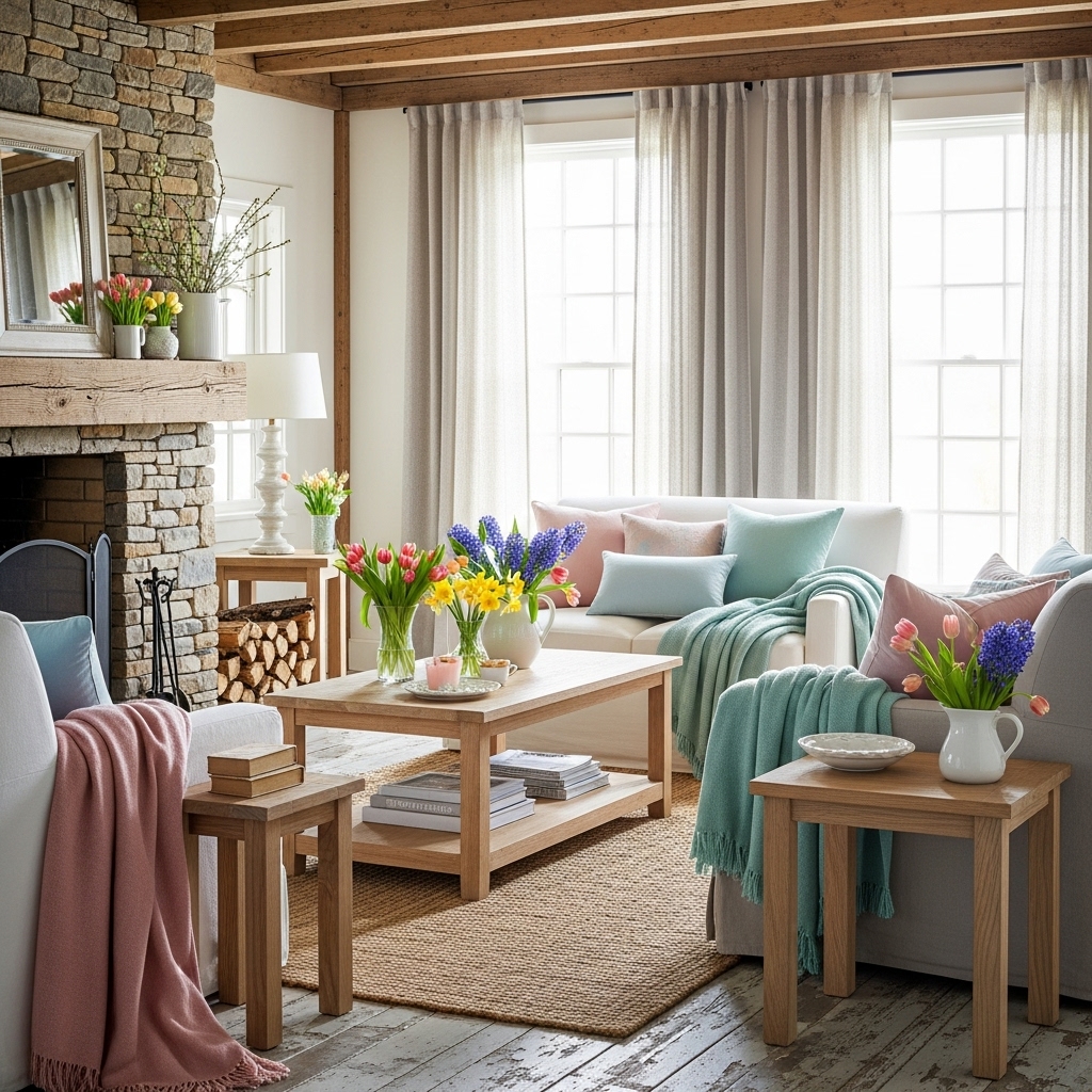 The third tip is to use layers of neutral or pastel textiles, which is a cornerstone of rustic spring decor ideas. Select throws, rugs, and pillows in soft beiges, creams, blush pinks, and light blues. Layering different shades and textures adds visual interest without overwhelming the space. Natural fabrics like linen and cotton feel fresh and are perfect for a relaxed spring atmosphere. Swap out heavy winter textiles for these breezy options to instantly lift your home’s mood.
