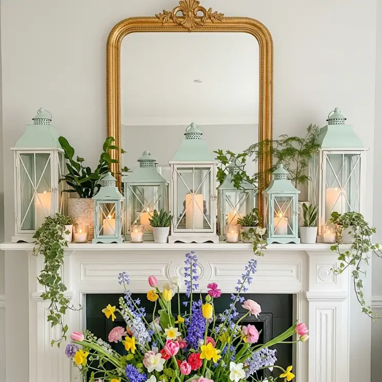 Good lighting turns your colorful spring mantel decor into a soft, relaxing focal point at night.