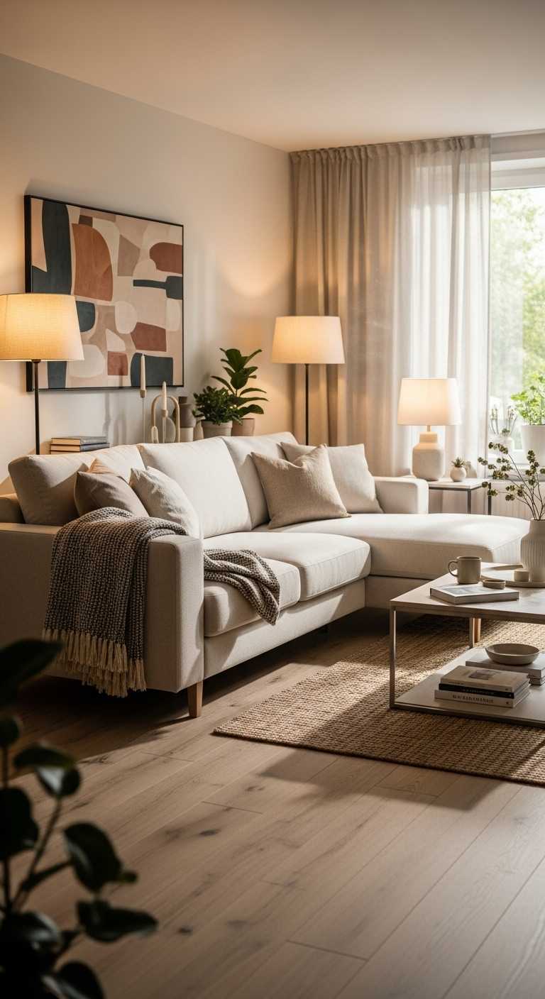 Warm living rooms rely on lighting that feels soft and layered. Instead of using only overhead lighting, incorporate table lamps, floor lamps, wall sconces, and warm LED bulbs.