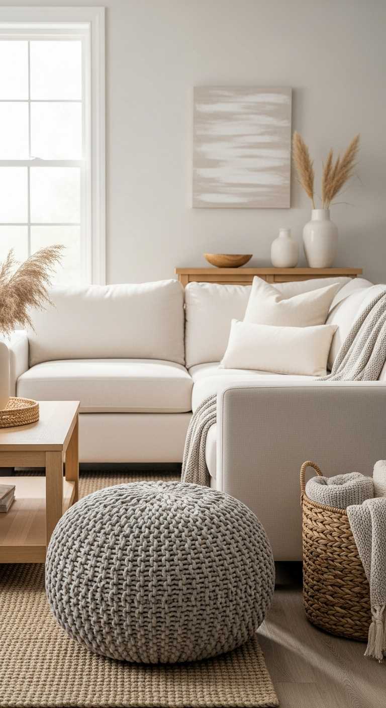 Use woven baskets, storage ottomans, and simple trays to keep things tidy.
