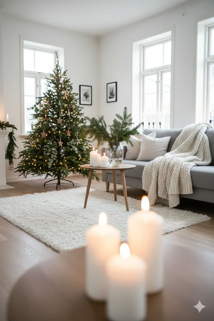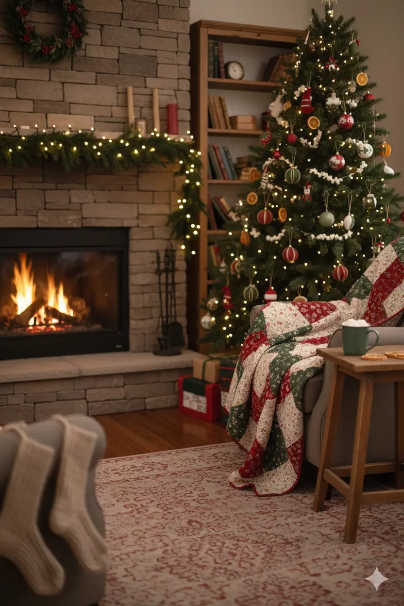If you have a chair near a window or fireplace, give that corner a small seasonal upgrade. A warm throw, a winter-scented candle, and a small tabletop tree make the spot feel special. It’s a nice way to extend the festive energy without crowding the main area. I’ve created these little corners in many homes; they’re always a hit. It also gives guests a quiet place to relax.