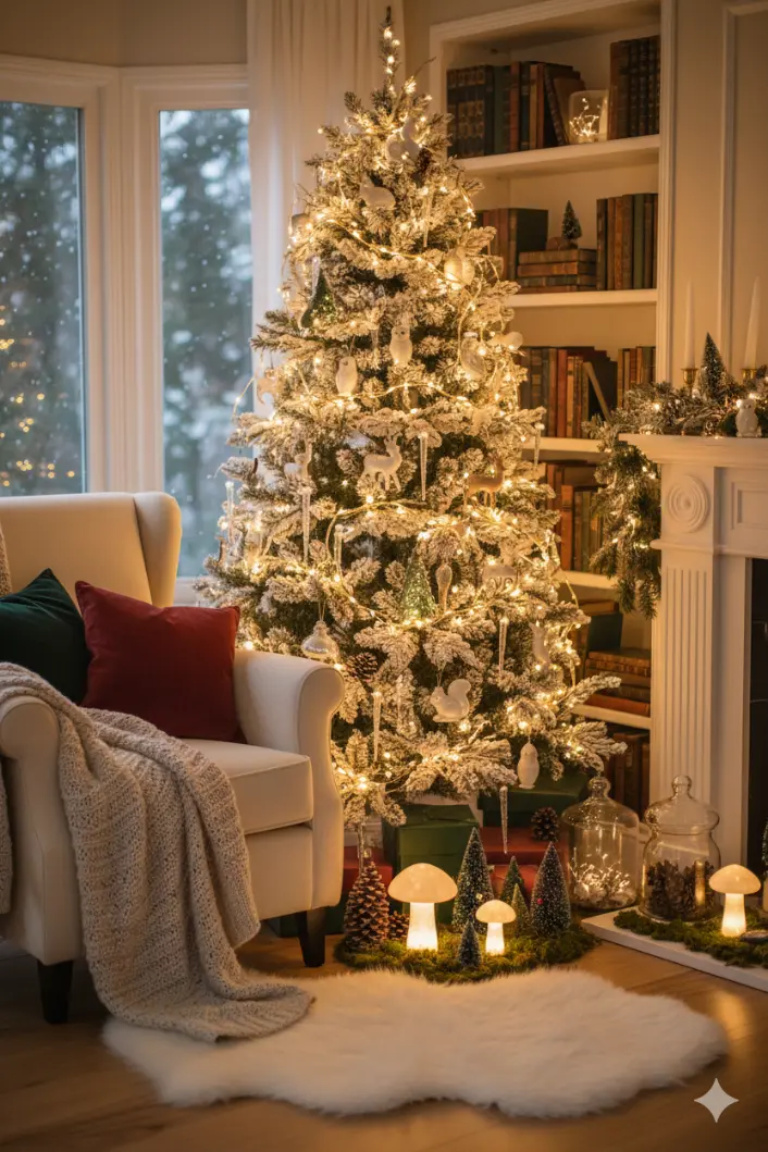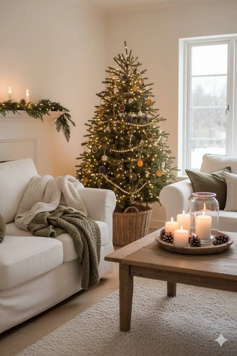 I’ve found that placing the tree slightly angled in a corner makes the whole room feel more intentional, especially in smaller living rooms. It softens the flow and gives you space to layer baskets, a soft throw, or even a small stool nearby. I usually suggest warm white lights and a mix of wood and glass ornaments if you want that calm, classic look. Think of the tree as part of the room’s layout, not an afterthought. It’s a simple shift that often makes the whole space feel more pulled together.