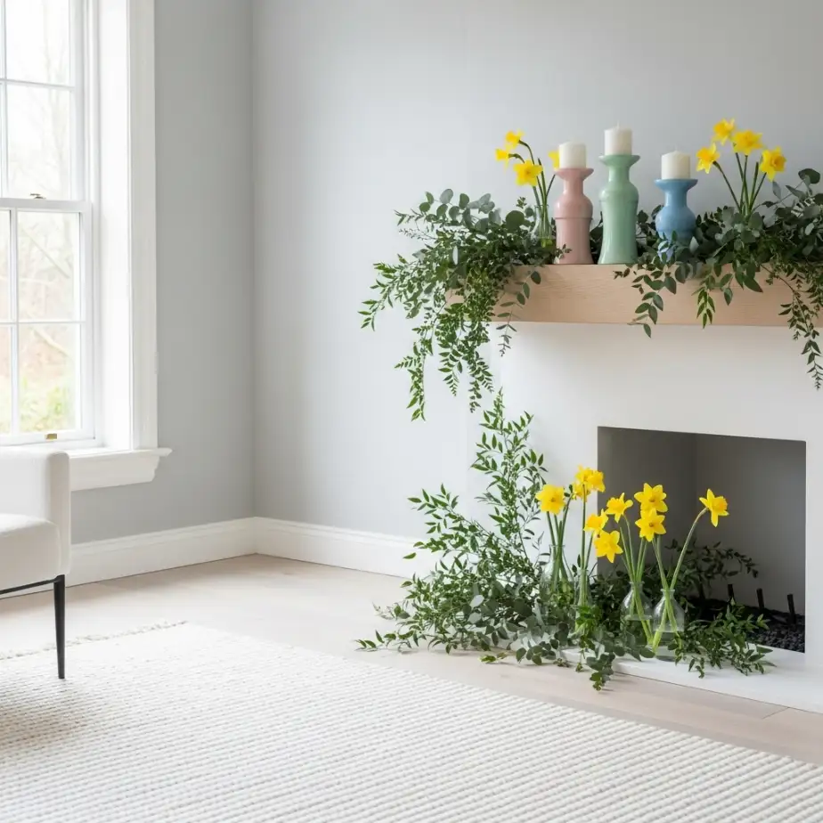If you go faux, look for greenery with variation in leaf size and color so it doesn’t read flat or plastic. Sometimes, just one generous bunch on one side of the mantel is enough. The point is to make the room feel like the outside is slowly waking up.