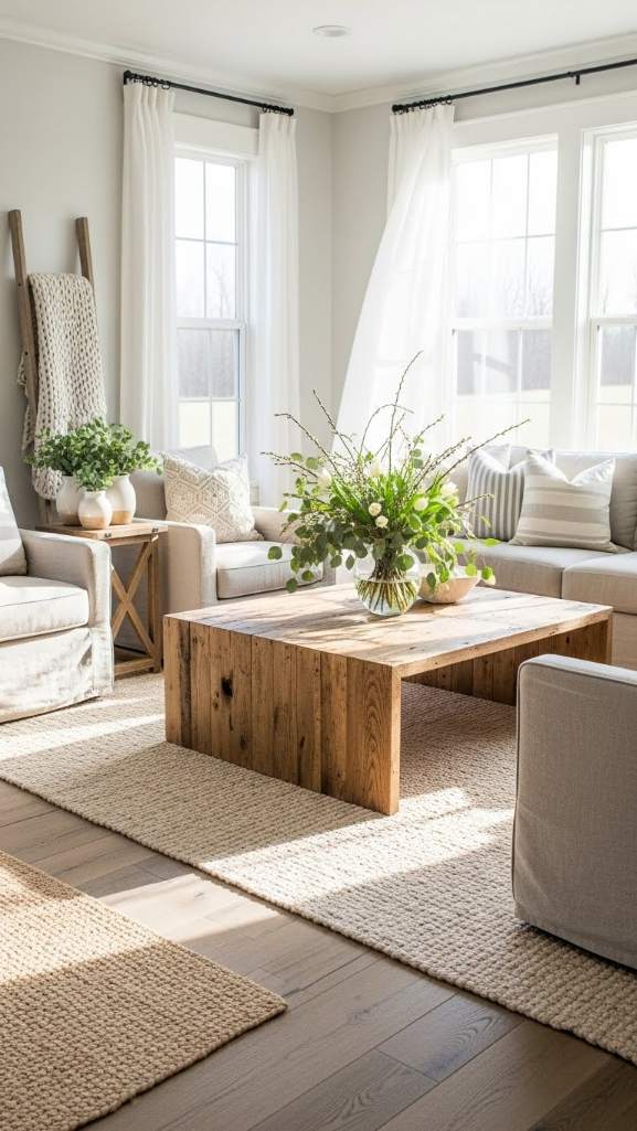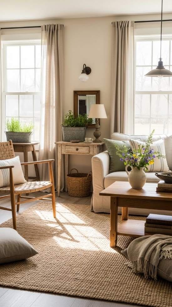 Refresh your living room by exchanging heavy drapes for light, airy curtains that allow sunlight to filter through. Sheer linen or cotton panels are perfect rustic spring decor ideas, as they evoke a breezy, relaxed look while brightening the room. Choose curtains in neutral or pastel shades to keep the design cohesive and understated. Allow curtains to puddle slightly on the floor for a laid-back, lived-in vibe that suits rustic aesthetics. This simple swap can dramatically open up your space and highlight the natural beauty of springtime.