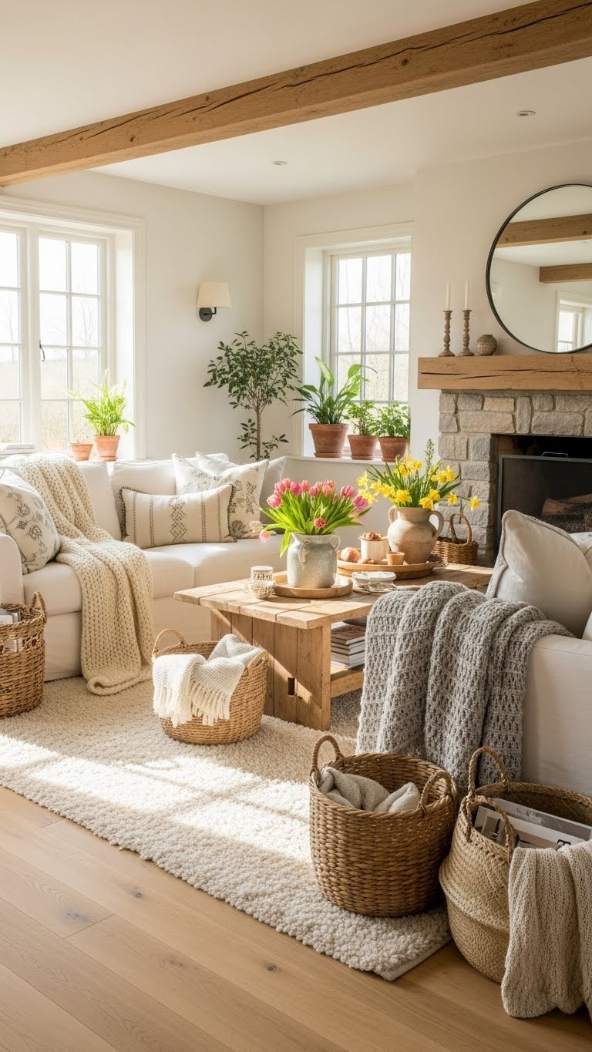 Woven baskets are both practical and stylish as part of your rustic spring decor ideas. Use them to store extra blankets, magazines, or children’s toys while adding texture and function to your living room. Baskets in natural materials like seagrass, rattan, or jute complement rustic themes and keep clutter neatly out of sight. Arrange several baskets in varying sizes to create visual interest in corners, under consoles, or beside seating. This solution not only helps you stay organized but also adds an artisanal, spring-ready accent to your decor.