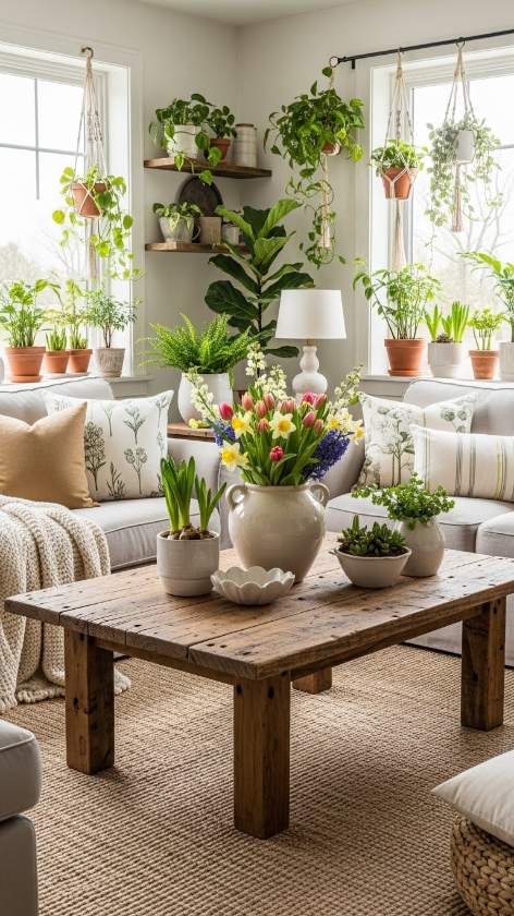Greenery is essential for rustic spring decor ideas, as it brings the freshness of nature directly into your living room. Consider placing large potted plants, like fiddle leaf figs or snake plants, in corners to anchor the space. Use smaller planters on coffee tables, shelves, and mantels to add varying heights and layers of interest. Not only do plants purify the air, but they also create a lively, rejuvenating atmosphere that’s in perfect harmony with rustic spring decor. If you’re short on time, opt for easy-care varieties or high-quality faux greenery for a lasting impact.