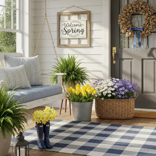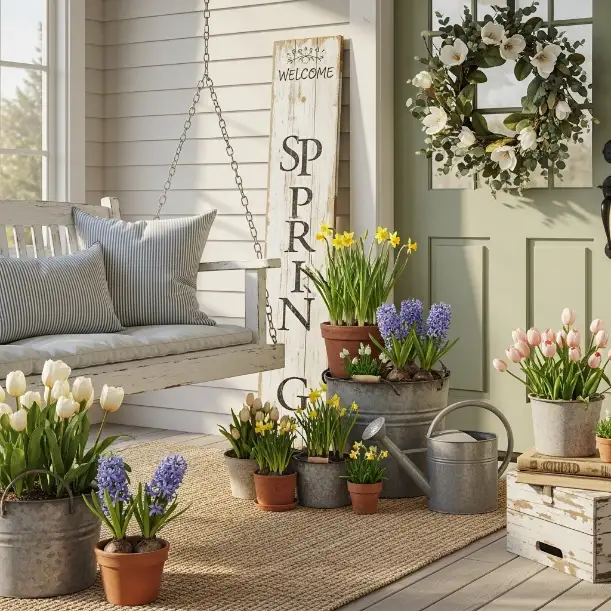 Farmhouse spring porch decor thrives on weathered metals—think old watering cans, metal trays, or even tin milk pails. Fill one with cut branches or faux blooms and place near your door as a seasonal touch.