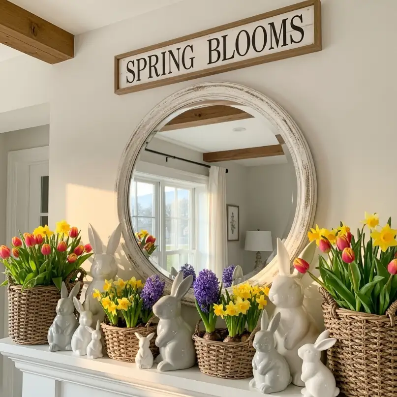 The mix keeps your spring mantel charming instead of themed. It also saves money because you can pull from what you already own.
