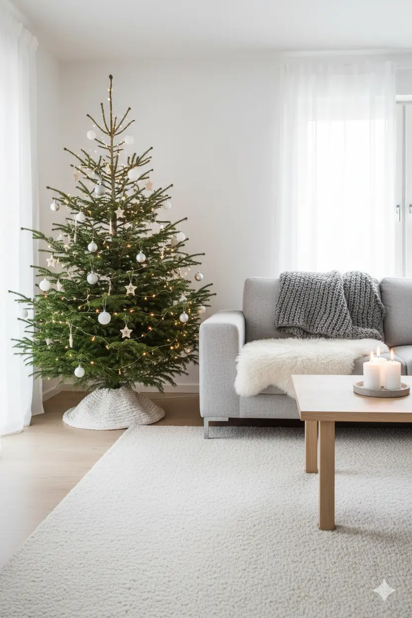 If you already have a rug down, consider adding a smaller one on top just for the season. Something with a soft texture, like a thick cotton weave or faux sheepskin, immediately makes the sitting area feel cozier. It also helps define the seating zone around the tree.