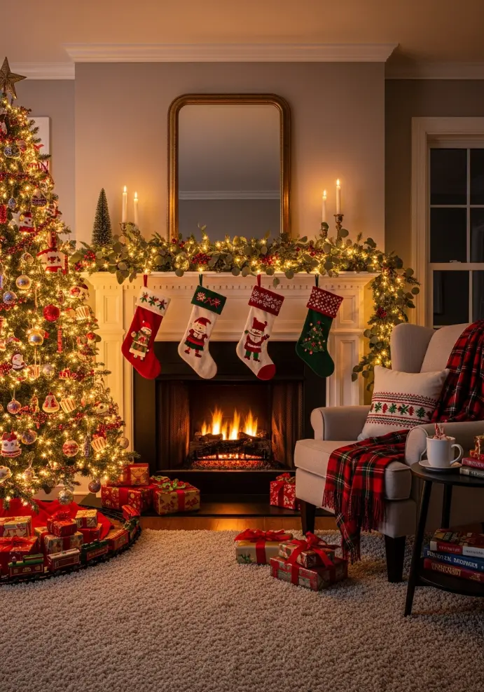 Perfectly matching stockings often look too staged. I suggest mixing fabrics: two knitted ones, a velvet one, and a canvas one. Keep the tones similar so they still feel cohesive. The slight variation makes the mantel feel more personal and lived-in.