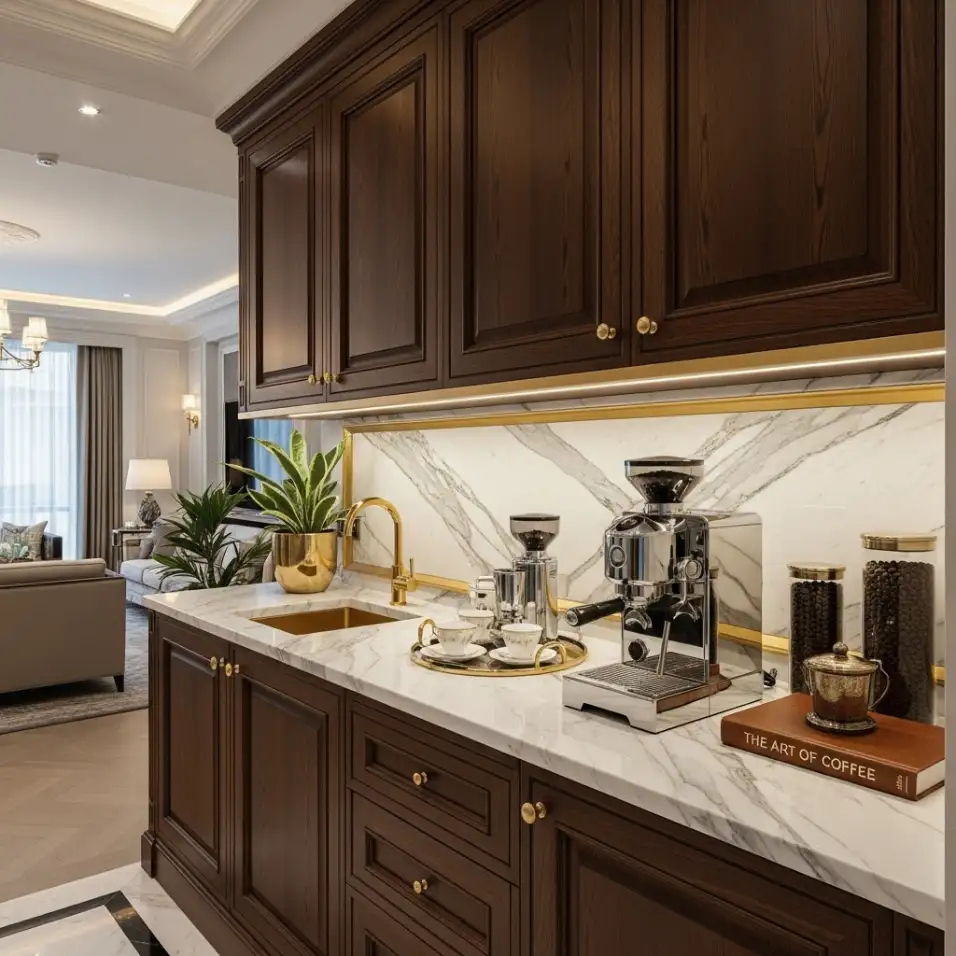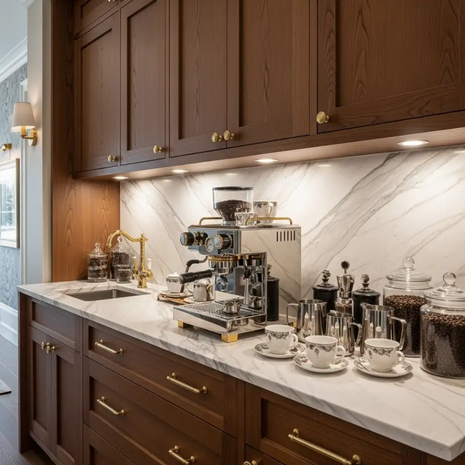 Warm metal accents add contrast without overwhelming awkward layouts. Brushed brass or aged bronze complements farmhouse wood tones. These materials add depth and visual interest. Metal accents improve function through durable hardware and fixtures. Subtle contrast helps define the coffee bar while maintaining a cohesive, warm aesthetic that feels comfortable and refined.