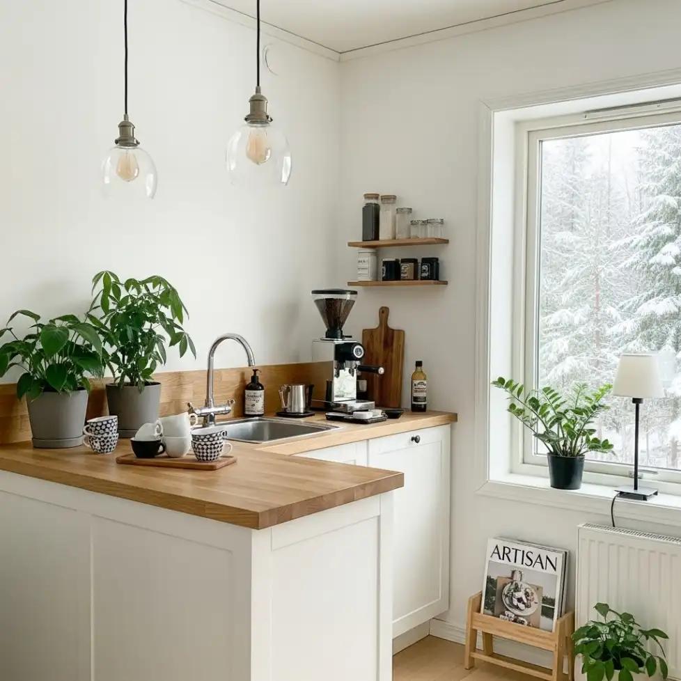 Compact appliances help maintain proper scale in awkward layouts. Oversized machines can overwhelm limited space. Smaller coffee makers and slim grinders support a balanced look. In farmhouse settings, pairing compact appliances with wood accents softens their appearance. This improves function by preserving counter space for prep and styling. Proper scale ensures the coffee bar feels comfortable and proportionate, even in narrow or shallow areas.