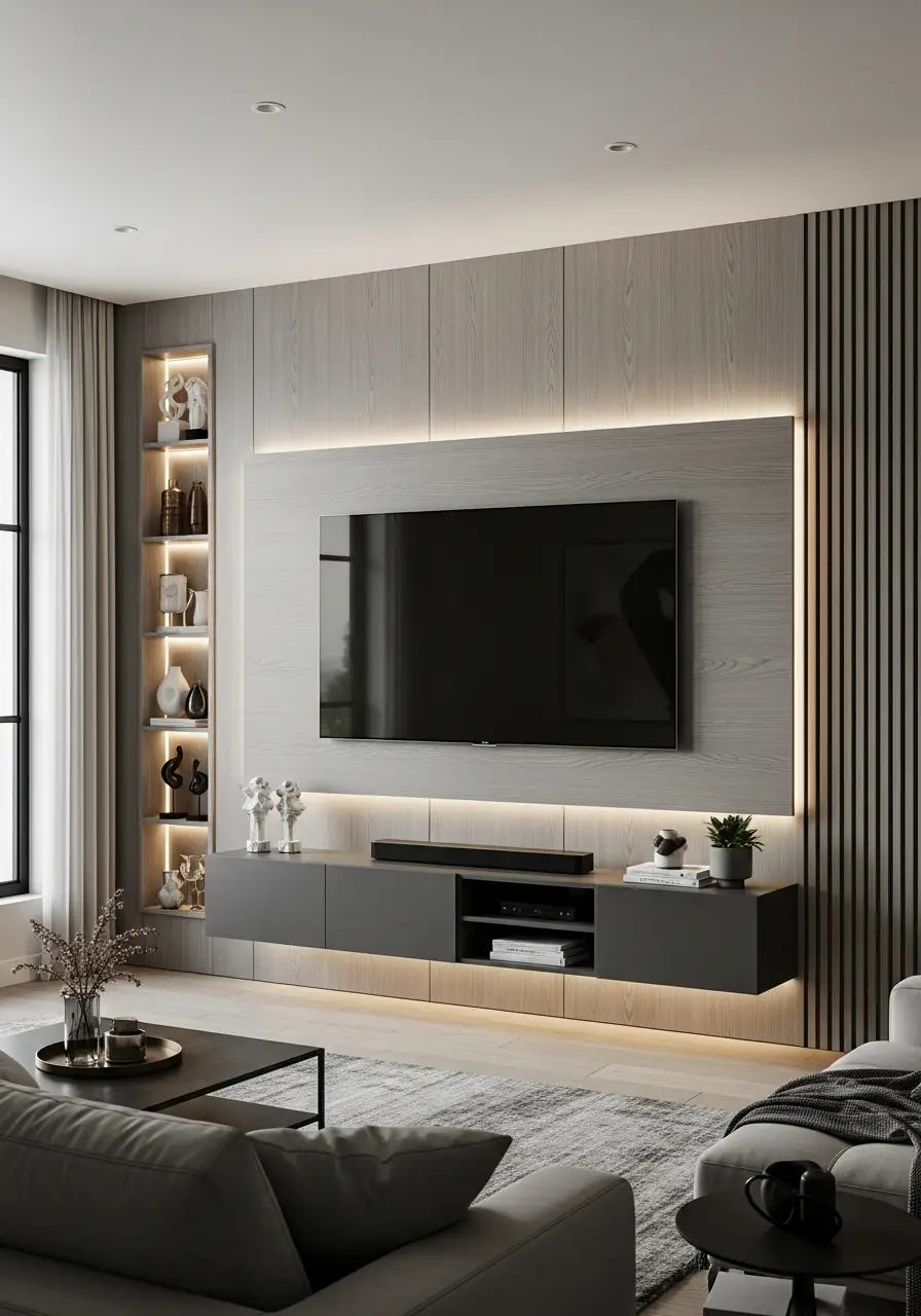 Vertical panels create height and elegance. This is a fantastic way to design a living room TV wall without adding too much texture.