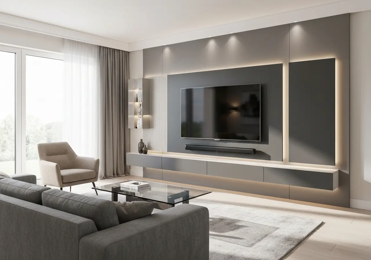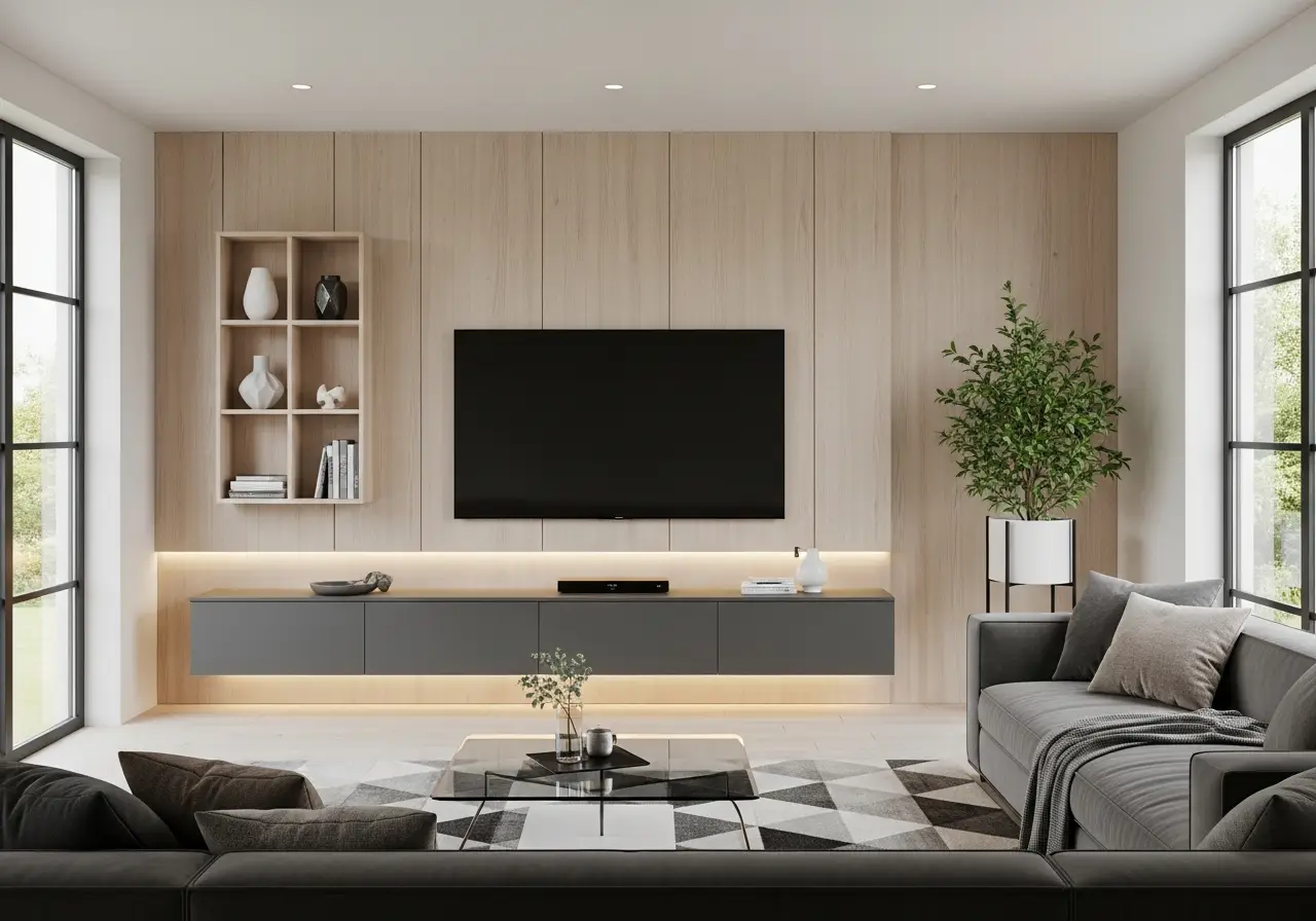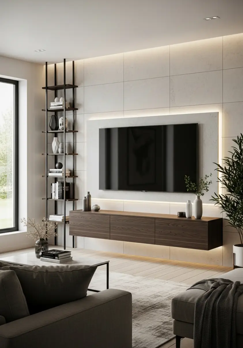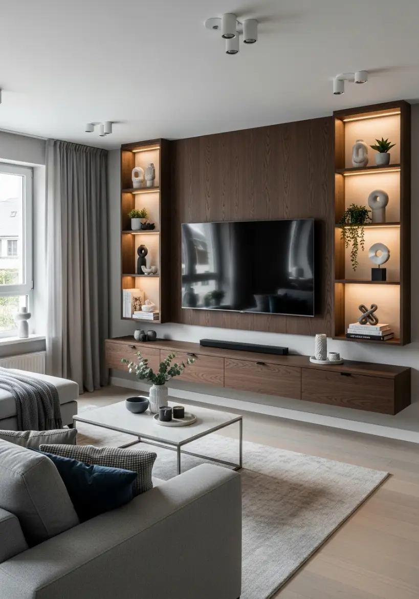 Instead of one central console, place two slim cabinets on each side of the TV. Keep them wall-mounted so the floor stays clear. This layout feels modern and structured.