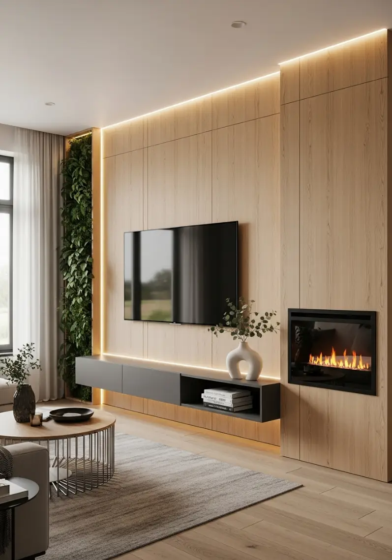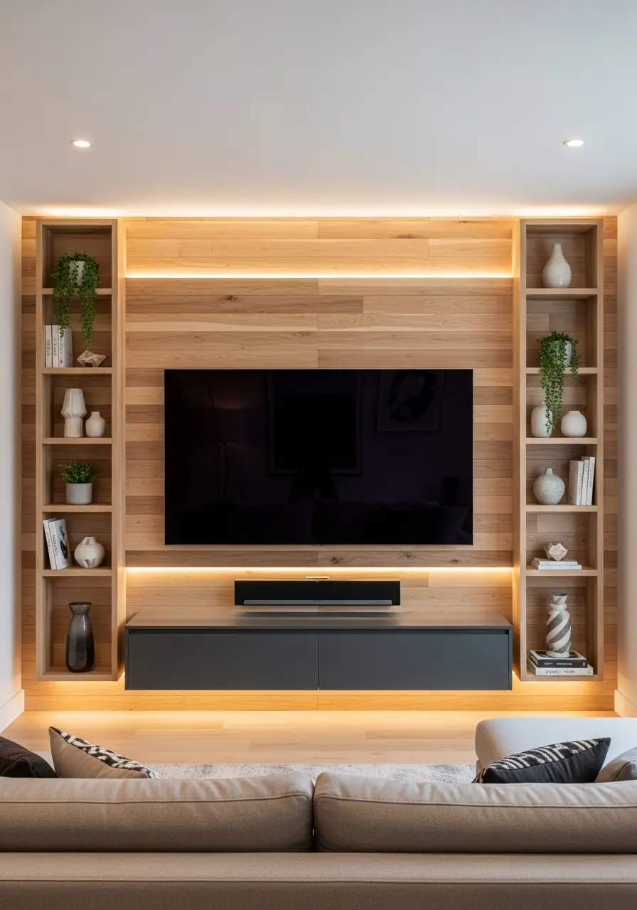 Wood slats add warmth and rhythm to a living room. When placed behind the TV, they create depth without overwhelming the space. Hidden lighting behind the slats adds a soft glow that looks beautiful in the evening.