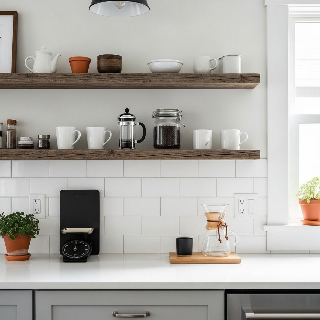 One powerful way to implement Farmhouse Coffee Bar Decor Ideas is by installing open shelves above your coffee station. Open shelving not only provides extra storage but also allows you to display pretty mugs, vintage canisters, and decorative jars. This creates an inviting look while keeping essentials within reach. Choose reclaimed wood for that authentic farmhouse feel, and stagger shelves at varying heights for visual interest. Function meets style, and your morning routine feels instantly more organized and appealing.