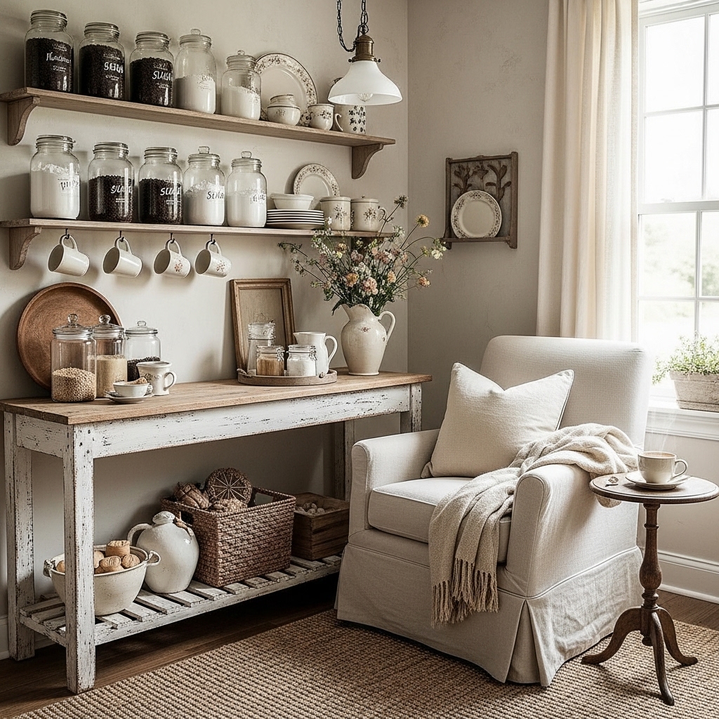 Personalization is what makes Farmhouse Coffee Bar Decor Ideas unique and meaningful. Display your grandmother’s teapot, framed old recipe cards, or inherited mugs for depth and sentimentality. These family pieces distinguish your morning nook from a generic setup and keep precious memories alive with every pour.