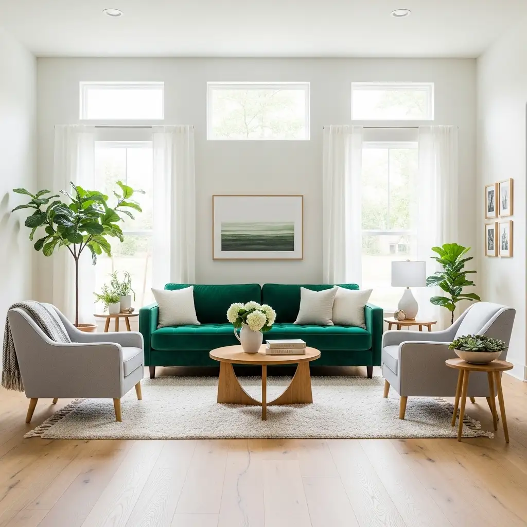 A small oak side table, a rattan tray, or a walnut picture frame repeats the grounded feel. These elements keep Green Couch Living Rooms from sliding toward a cold, contemporary showroom vibe.