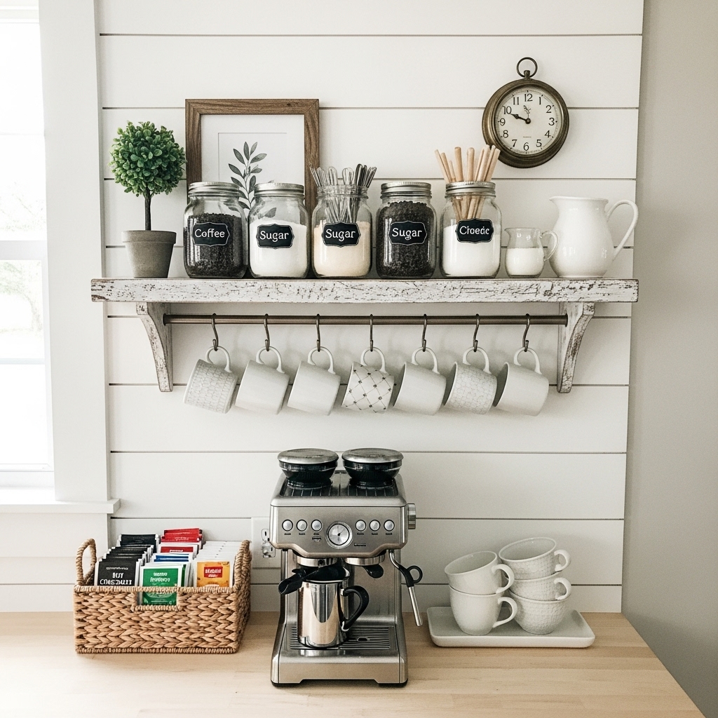 7. Installing shiplap as a backdrop instantly makes your coffee bar the focal point of your kitchen or dining area. Even peel-and-stick shiplap panels work wonders for busy people looking for quick Farmhouse Coffee Bar Decor Ideas. The subtle texture and neutral color palette highlight your coffee accessories while giving the space depth. It’s a rewarding DIY that pays off big in style with minimal effort. Shiplap also pairs beautifully with rustic shelving, creating a cohesive look.