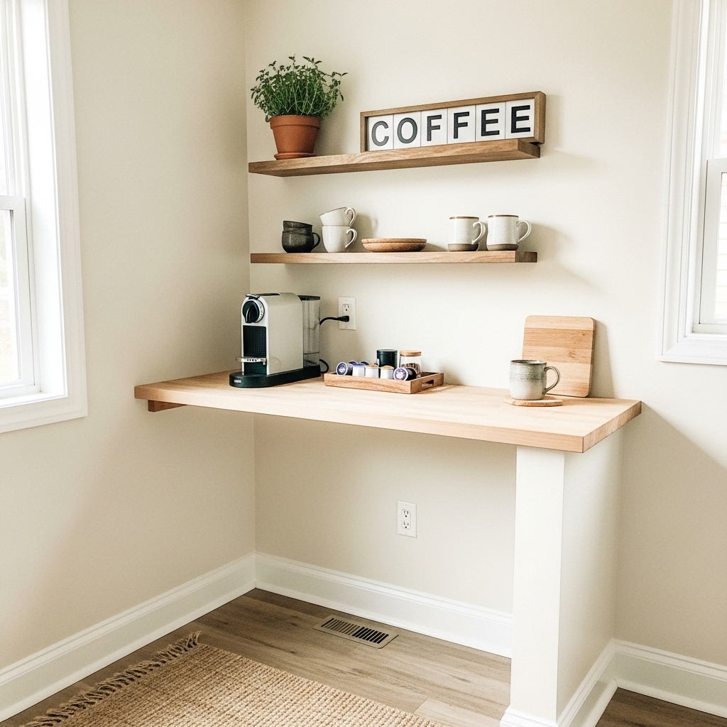 2. Floating shelves are a farmhouse staple, and installing a couple above your coffee station maximizes both storage and style. Opt for distressed or reclaimed wood to tie into Farmhouse Coffee Bar Decor Ideas. Use them to display mugs, jars, or decorative canisters so everything you need is within easy reach. This keeps your countertop clutter-free, making morning routines faster. Plus, the simple lines and rustic materials instantly enhance the overall look without needing major renovations.