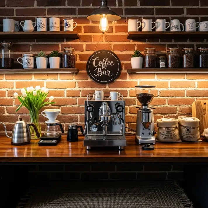 Choose accessories that complement your rustic furniture while adding a refined touch. For instance, a beautiful ceramic sugar bowl can bring a hint of elegance to the counter, while a set of polished gold or silver spoons adds sophistication. These accessories don’t have to be expensive—they need to fit the overall aesthetic of your coffee bar.