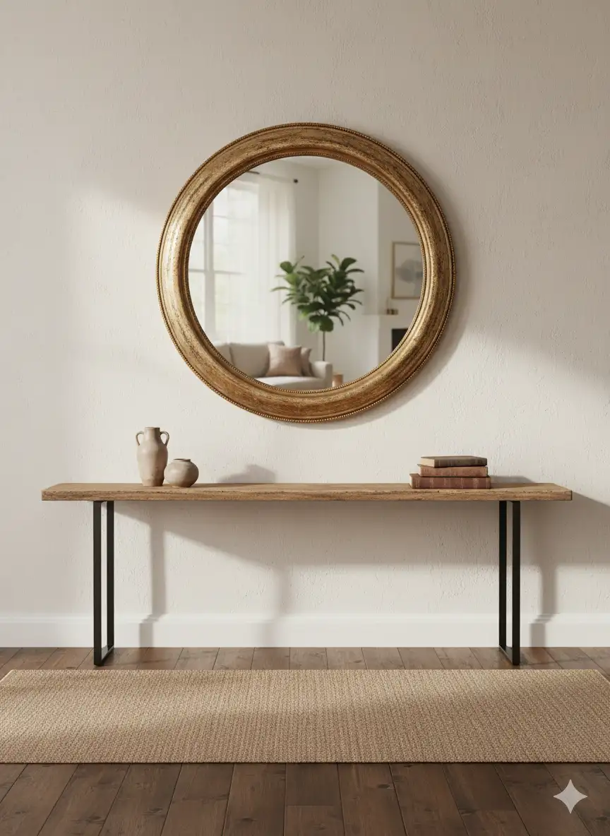 Round or organic-shaped pieces break up all the straight lines that living rooms tend to have. I’ve used round mirrors, oval canvases, and soft-edged sculptures to add a little movement to the wall. They’re especially nice over consoles or between windows where rectangular art can feel too predictable. When choosing a piece, look for something with a texture you like, since the shape is already doing part of the work. It’s a simple way to shift the room’s energy without much effort.