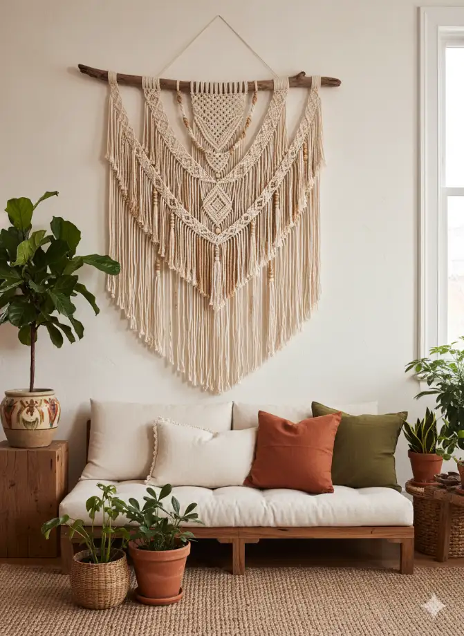 Macrame has made a big comeback, but I pick pieces that look simple and textural rather than overly intricate. They add a handmade feel that softens modern spaces. I’ve hung them in living rooms that needed warmth but not more heavy furniture or art. Look for natural fibers and neutral tones so the piece feels timeless. And make sure it hangs at a comfortable height, too high and it can look disconnected from the rest of the room.