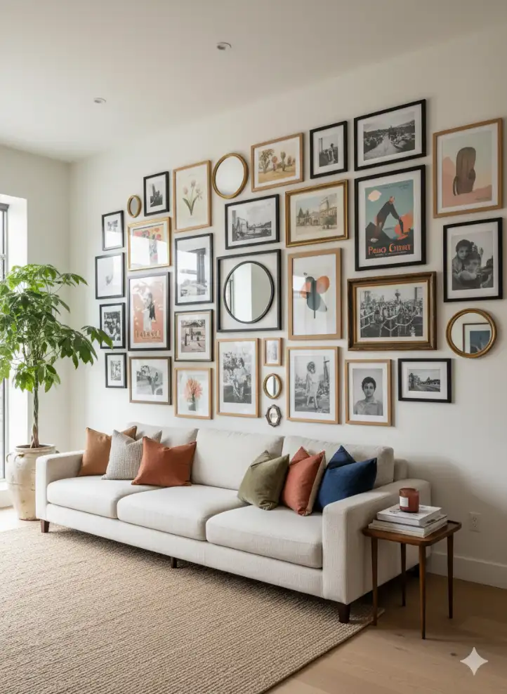 Narrow ledges are perfect when you want a laid-back, layered look without committing to nails everywhere. I often use them in long hall-like living rooms or above sofas where hanging pieces feel too rigid. Leaning art gives you freedom to swap things out whenever you feel like it. Keep taller pieces in the back and shorter ones upfront so the arrangement feels natural. It’s one of those “easy wins” that always looks more intentional than people expect.