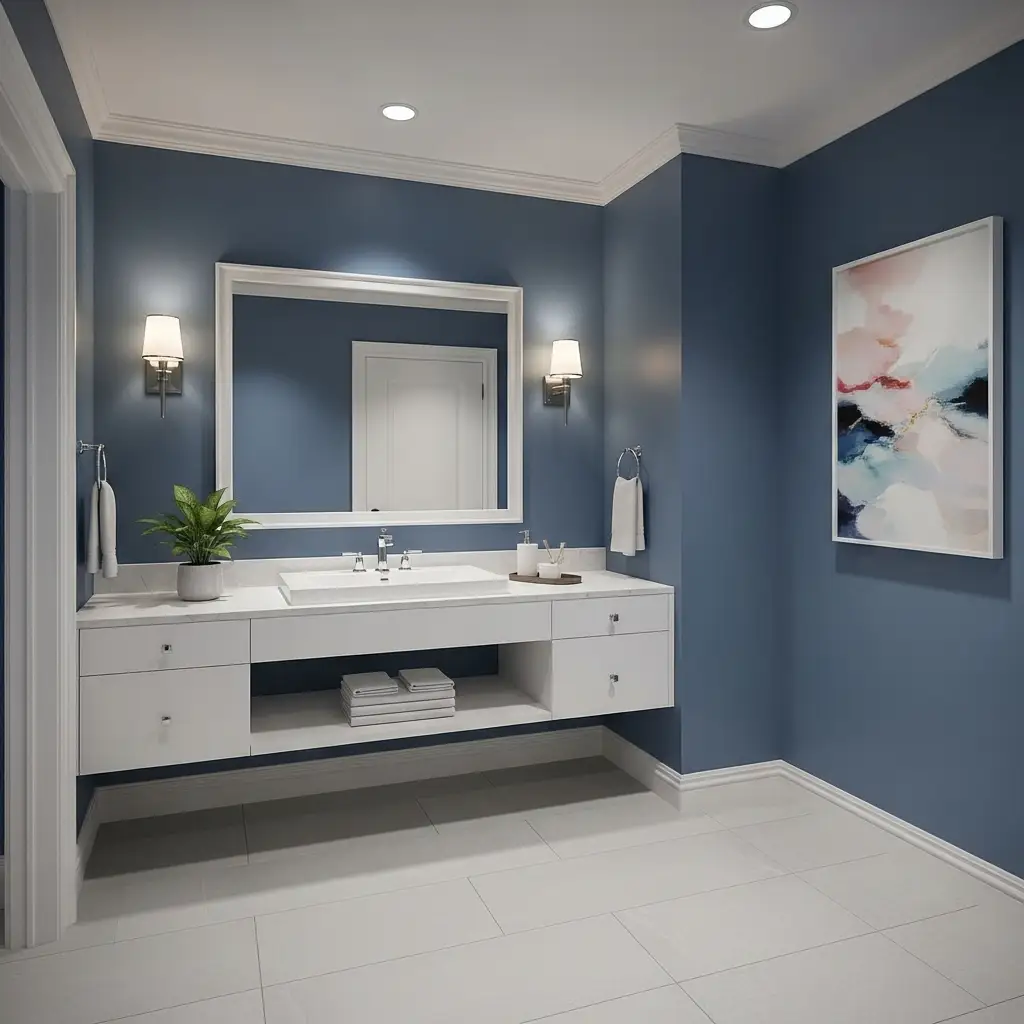Choose one small watercolor or black-and-white photograph in a light wood frame. Keep it away from direct splash zones. The art should echo the blue palette without being another cliché beach print.