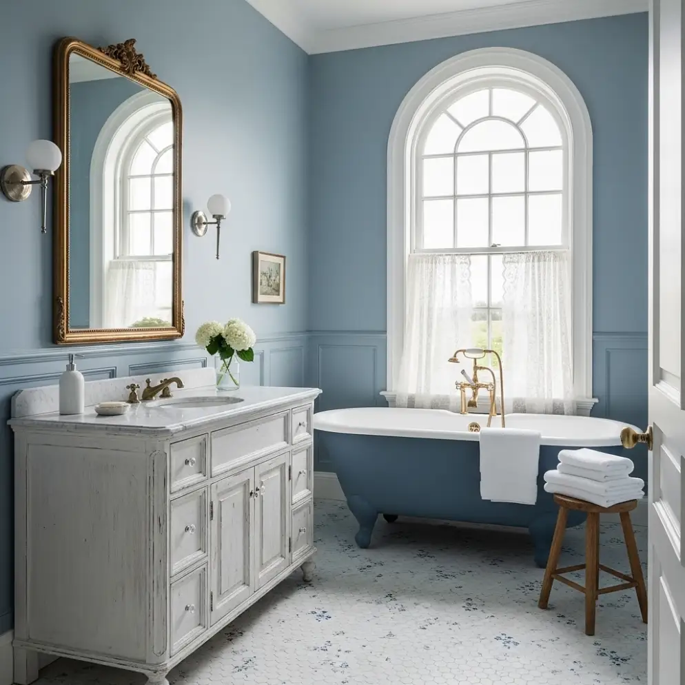 Try a vintage-style arched mirror with a slim brass frame. The curves break up straight lines in tile and cabinetry, and the reflective surface amplifies the blue tones. Thrift stores often hide gems—one client found hers for fifteen dollars and we had it re-silvered for a fraction of the cost of new retail.