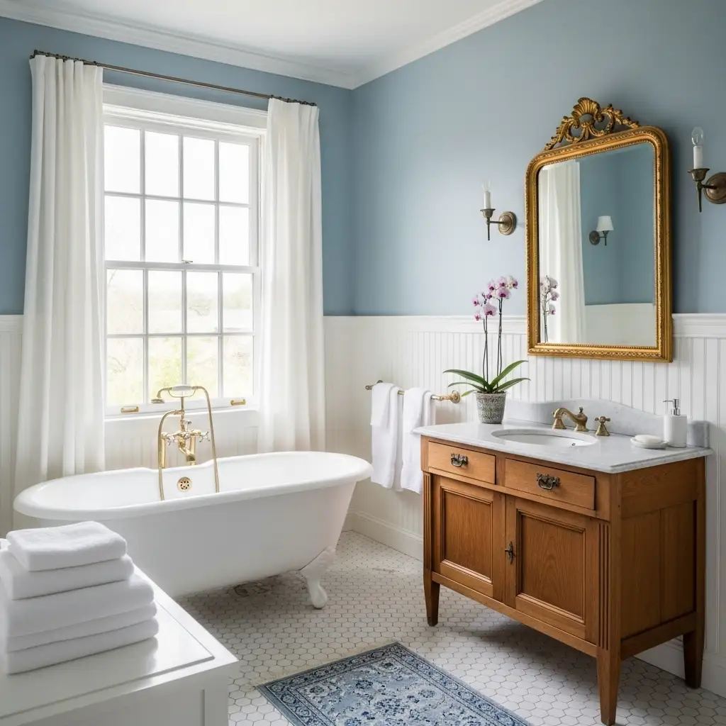Painting is the most affordable, renter-friendly way to transform a bathroom. Instead of a single color, try two complementary shades of French blue. Think of a misty dawn sky meeting deeper ocean water.