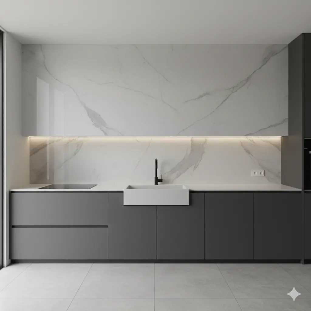 For those who love quiet luxury, a full marble slab backsplash feels effortlessly elegant. It creates a seamless flow between countertop and wall, making the kitchen appear taller and calmer. The veining becomes the star of each slab, a piece of natural art.