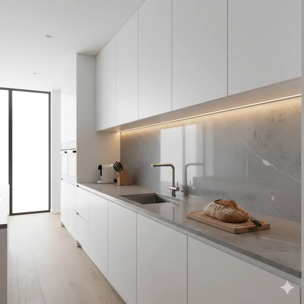 Designer tip: Pair glass with integrated lighting under cabinets to make the entire surface glow softly in the evening.